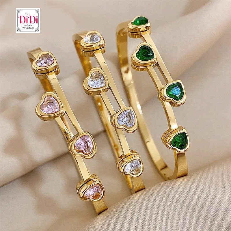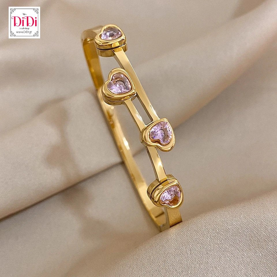 Ατσάλινο βραχιόλι βέργα με καρδιές, ροζ πέτρες, οβάλ, σε χρυσαφί 08122319GP