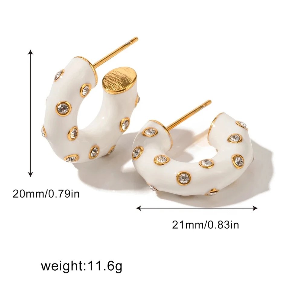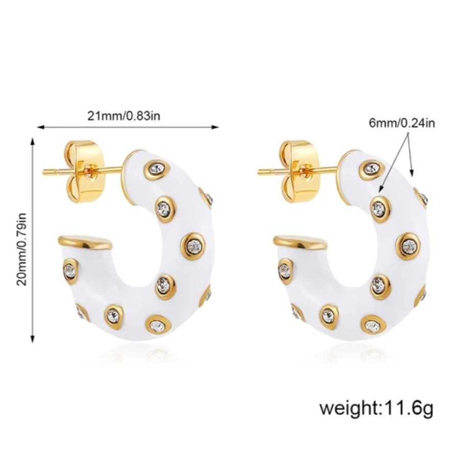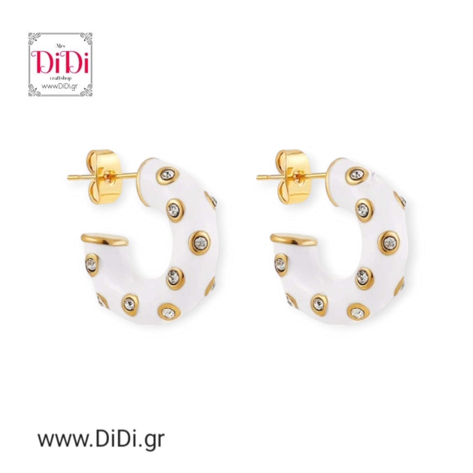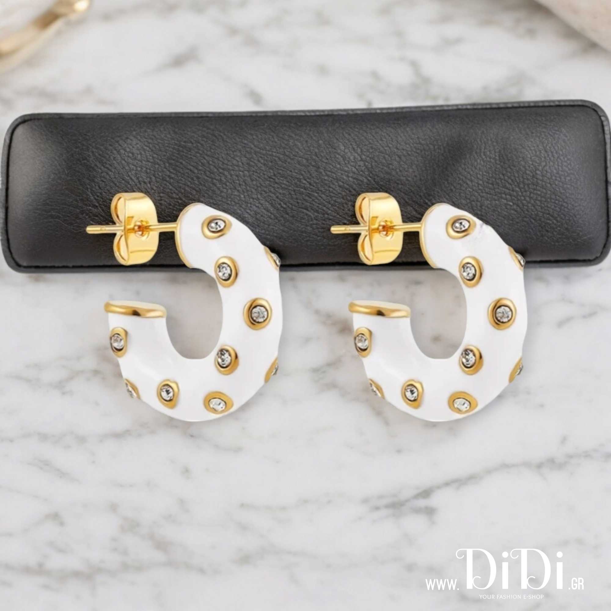 Σκουλαρίκια ατσάλινα, κρίκοι με λευκό σμάλτο και ζιργκόν Τσεχίας, σε κίτρινο χρυσό 27032419