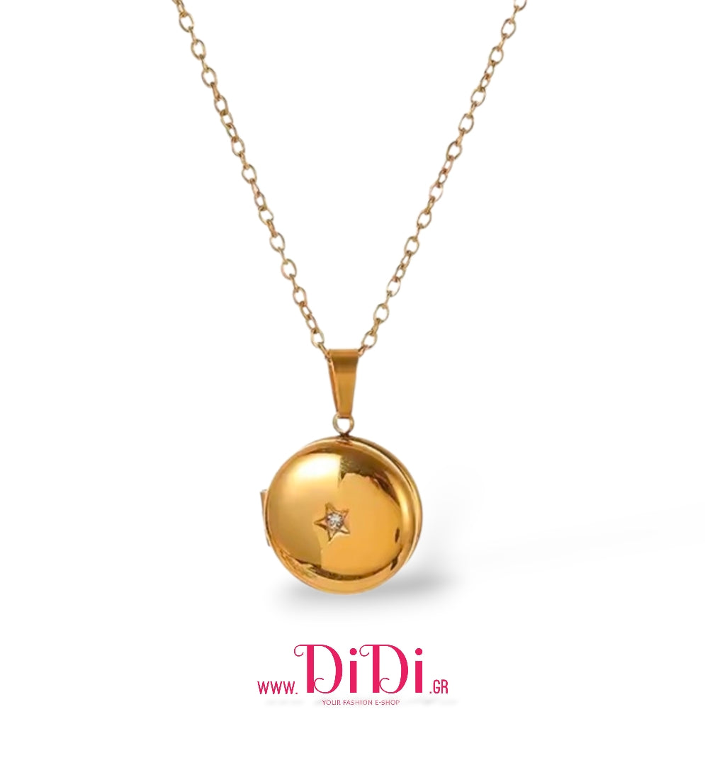 Κολιέ ατσάλινο μενταγιόν ανοιγόμενο στρογγυλό με ζιργκόν, κίτρινο χρυσό, 28042617