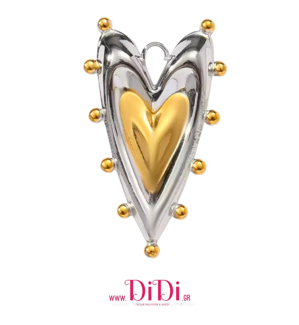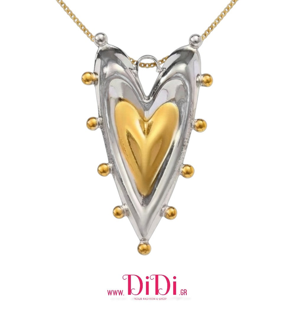 Κολιέ καρδιά ατσάλινη με σχέδιο, σε ασημί - κίτρινο χρυσό, 0802267