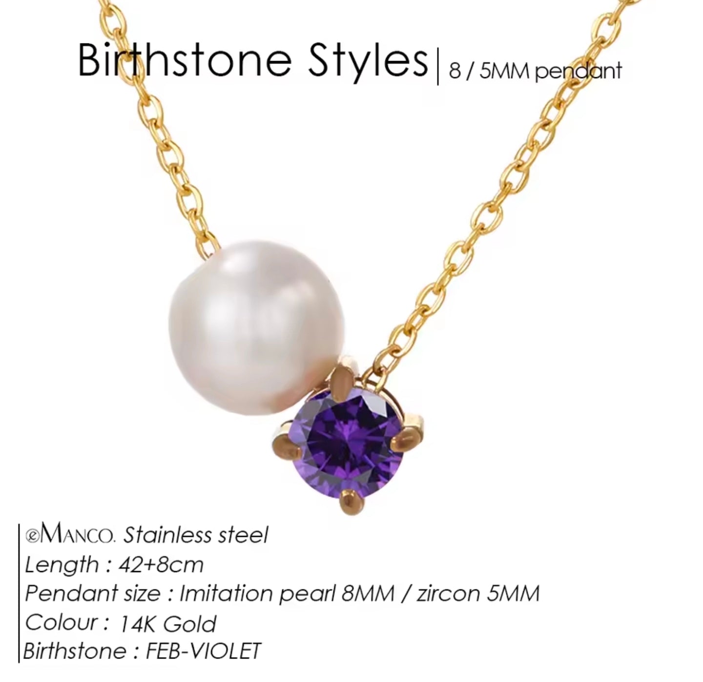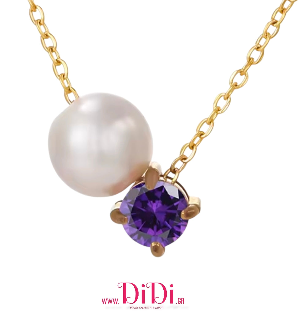 Κολιέ ατσάλινο, μοβ ζιργκόν και ακριλική πέρλα, σε κίτρινο χρυσό, 0503262