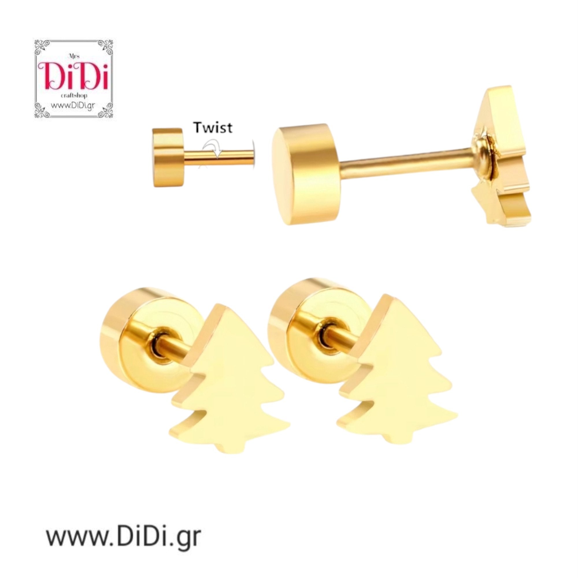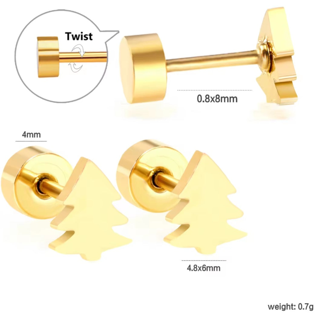 Σκουλαρίκια ατσάλινα, δεντράκι Χριστουγεννιάτικο σε κίτρινο χρυσό, 1312245