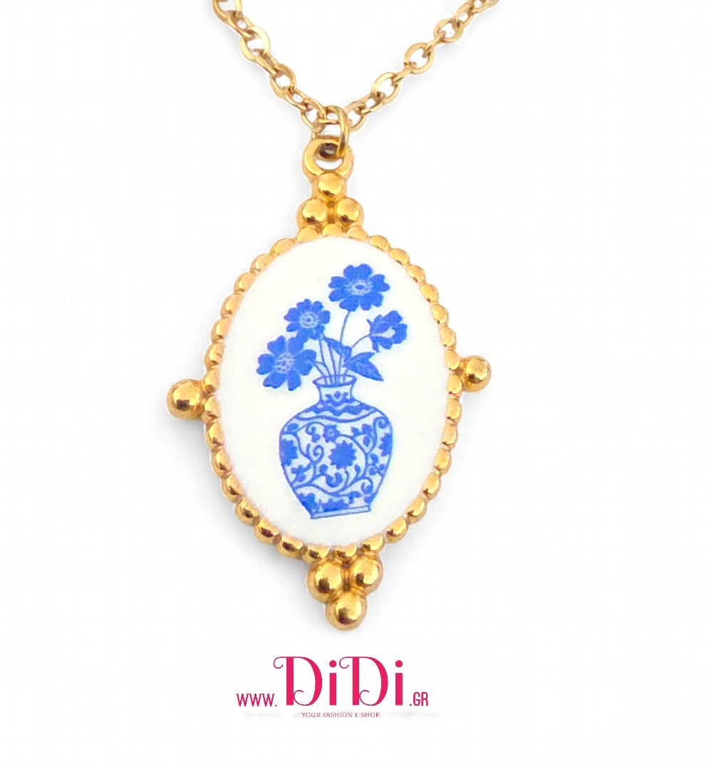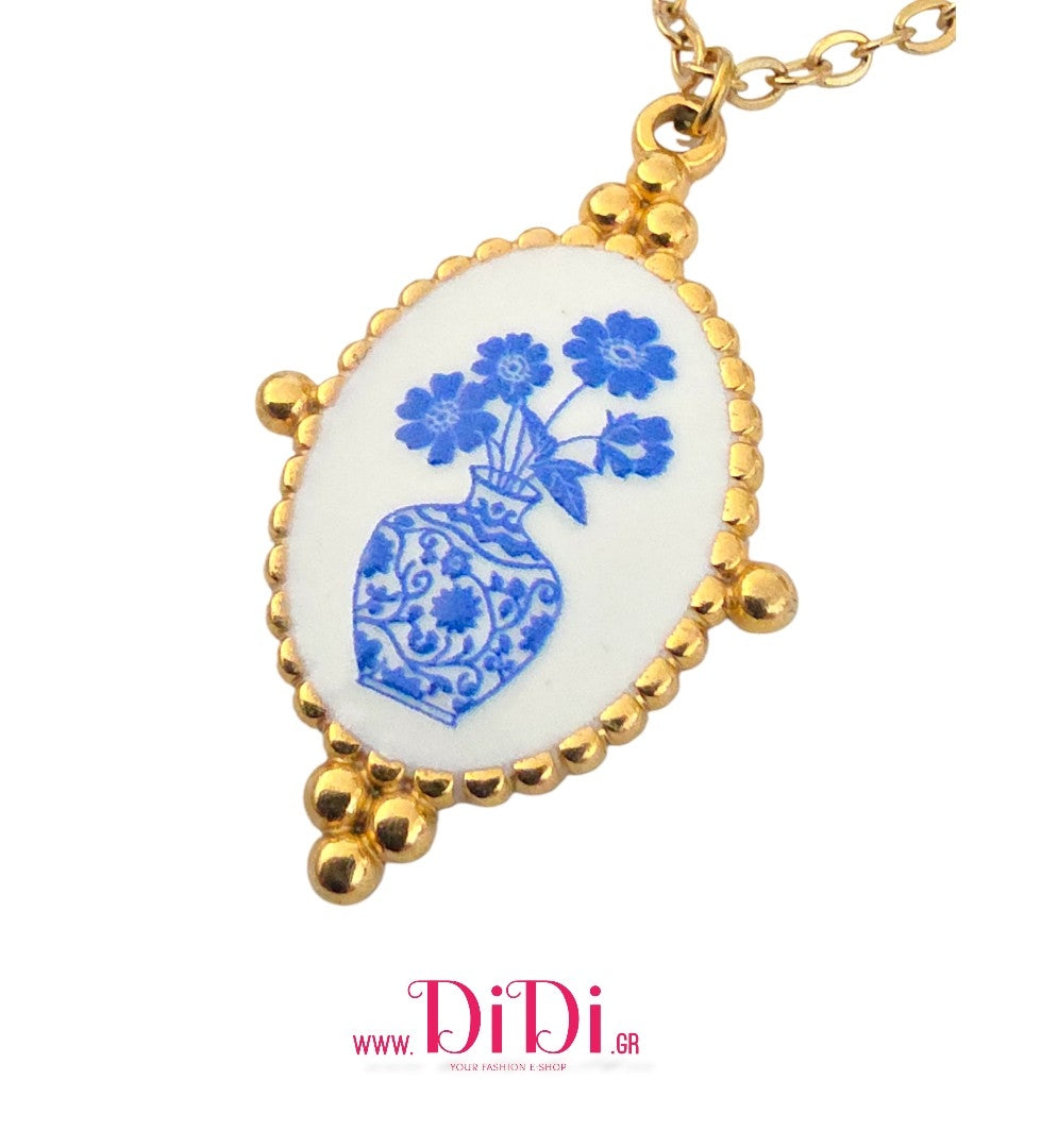 Κολιέ ατσάλινο με λευκό σμάλτο και μπλε σχέδιο, σε κίτρινο χρυσό, 0303261