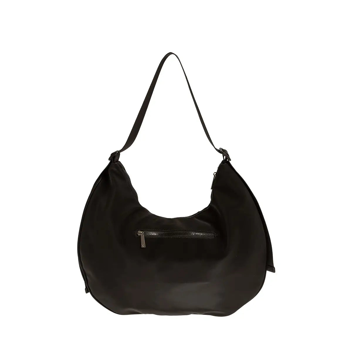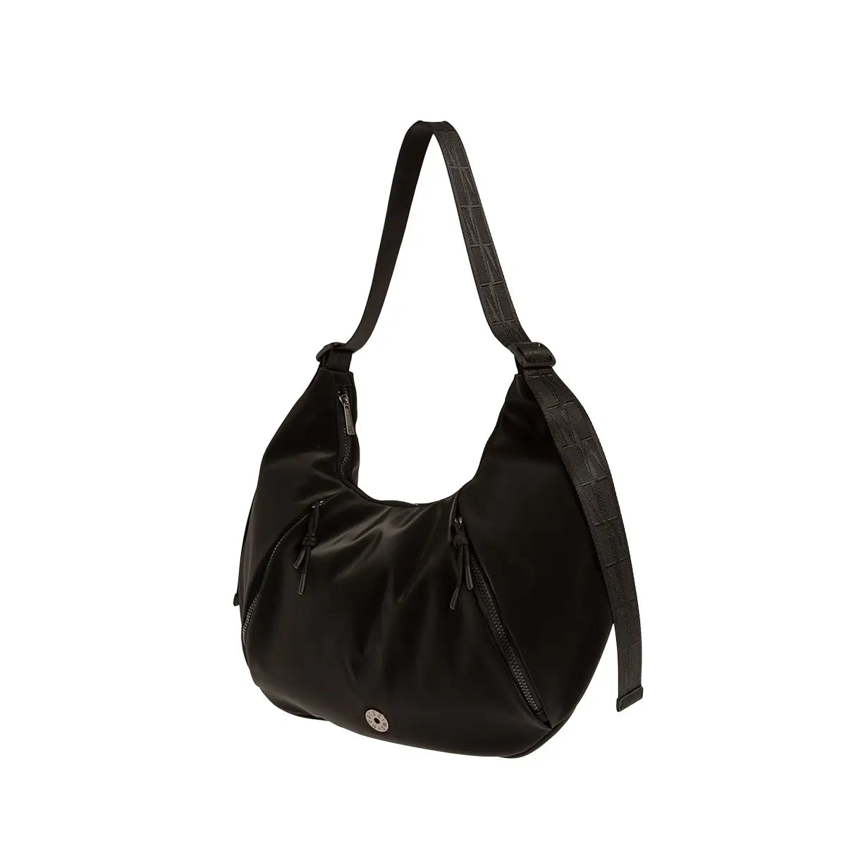 Γυναικεία τσάντα ώμου από ανθεκτικό συνθετικό δέρμα με αδιάβροχη υφή και μαύρους ιμάντες με το λογότυπο. Κλείνει με φερμουάρ και στο εσωτερικό της υπάρχουν δύο πλαϊνά βοηθητικά τσεπάκια, το ένα εκ των οποίων κλείνει με φερμουάρ. Στην μπροστινή όψη υπάρχουν δύο εξωτερικές τσέπες με φερμουάρ και στην πίσω όψη επιπλέον τσέπη με φερμουάρ. Το λουράκι της είναι ρυθμιζόμενο με δυνατότητα χιαστί εφαρμογής.