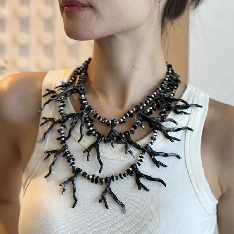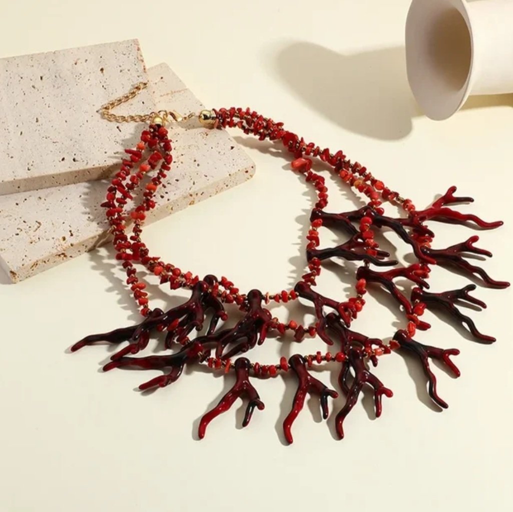 Κολιέ τριπλό, με ακριλικές χάντρες κοραλλιού, γκρενά, 22072410