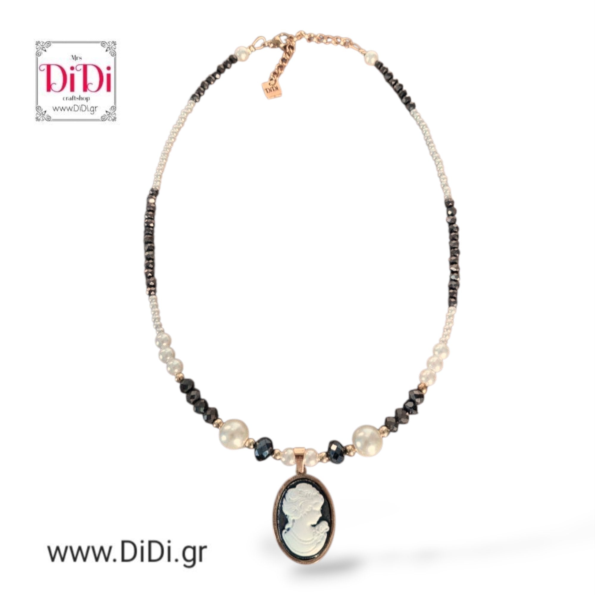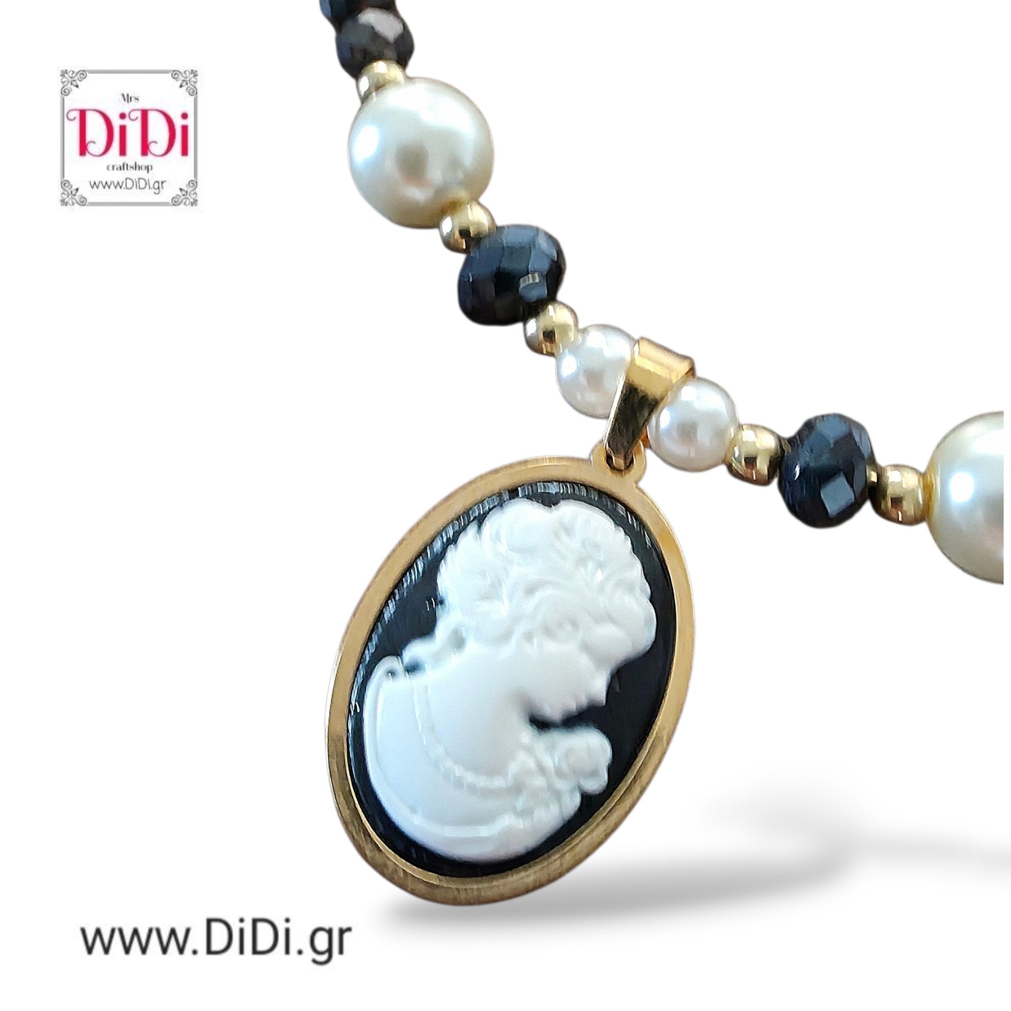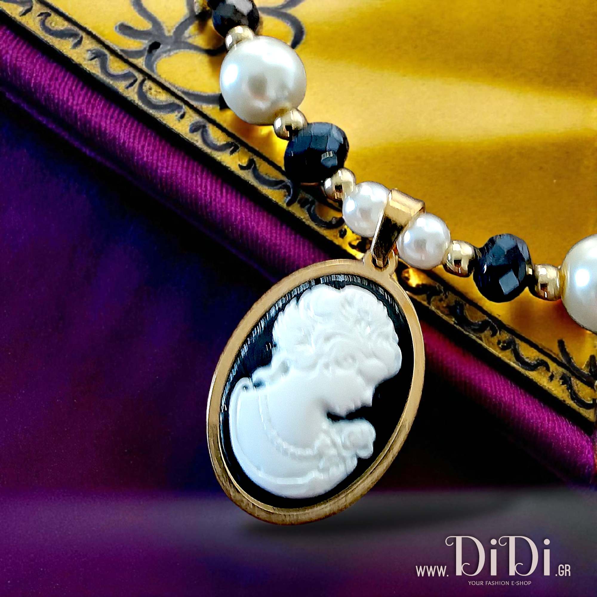 Κολιέ ατσάλινο με γυάλινες πέρλες & κρύσταλλα, στοιχείο ατσάλινο με μαύρο καμέο 1,8cm x 2,5cm, σε κίτρινο χρυσό, 1410252